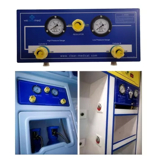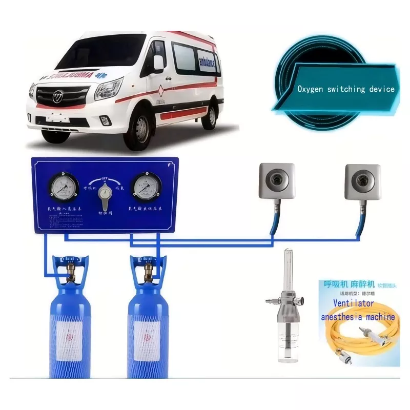 Diese medizinische Einheit für medizinische Gasverteiler im Krankenwagen eignet sich für Krankenwagen mit hohem Sauerstoffverbrauch. Es gibt einen Hochdruck-Sauerstoff in Flaschen durch Metallschlauch in die Hauptpanel-Panel-Rohrleitung in Flaschen ein, und der Hochdrucksauerstoff wird nach Abdrücke an das Sauerstoffterminal über die Verwendung von Niedrigdruckpipeline geliefert, die als Sauerstoffquelle für die Verwendung von Sauerstoffquellen verwendet werden soll. Das Arbeitsprinzip besteht darin, den Hochdrucksauerstoff in niedrigen Druck zu dekomprimieren und über die jeweilige Rohrleitung an den Sauerstoffanschluss zu liefern, um den Sauerstoffanschluss und den Beatmungsanschluss zu versorgen. Das Bedienfeld kann gleichzeitig mit zwei oder mehr Sauerstoffzylinder angeschlossen werden, um den Flaschen-Hochdrucksauerstoff auf einen bestimmten Druck zu dekomprimieren, der eine Art Gerät für die zentralisierte Gasversorgung darstellt. Das Bedienfeld besteht aus einer Hochdruckpipeline aus Metallschlauch, die durch G5/8-Gewinde mit den Sauerstoffzylinder verbunden ist. Jeder Sauerstoffzylinder ist mit einem entsprechenden Hochdruckschaltventil an das Bedienfeld angeschlossen, das die jeweilige Hochdruckrohrlinie steuert. Die Hochdruckrohrlinie, die jeden Sauerstoffzylinder am hinteren Ende des Schaltventils verbindet, ist miteinander verbunden, und der Verteiler ist mit einem TEE-Stecker in der Mitte des Krümmers ausgestattet, um den Hochdruckmessgerät, den Regler und die Hochdruckrohrlinie in Reihe zu verbinden. Der Hochdruckmessgerät wird verwendet, um den Sauerstoffdruck in der Hochdruckrohrleitung des Bedienfelds zu überwachen, und der Regler wird verwendet, um den Hochdrucksauerstoff auf den erforderlichen Druck zu regulieren und dann an den Niederdruckanschluss auszugeben. Das Niederdruckend ist mit dem Sauerstoffanschluss, dem Sicherheitsventil und dem niedrigen Druckmessgerät angeschlossen, mit dem der Druck in der Niederdruckpipeline des Bedienfelds überwacht wird, während das Sicherheitsventil das Gas automatisch ausschöpft, wenn der Ausgangsdruck höher ist als der Auslegendruck, um die Sicherheit und Stabilität des Ausgangsdrucks zu gewährleisten. Dieses System eignet sich für jeden Ort, an dem Gaskonvergenzwechsel erforderlich ist, um Gasdruck und Gasreste zu überwachen, wie z.